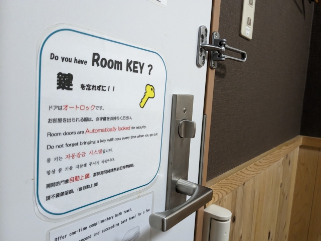 お部屋にはしっかりカギも付いています。オートロックタイプなので、トイレや洗面所に行く際には持っていかないと締め出されることになるのでご注意を。