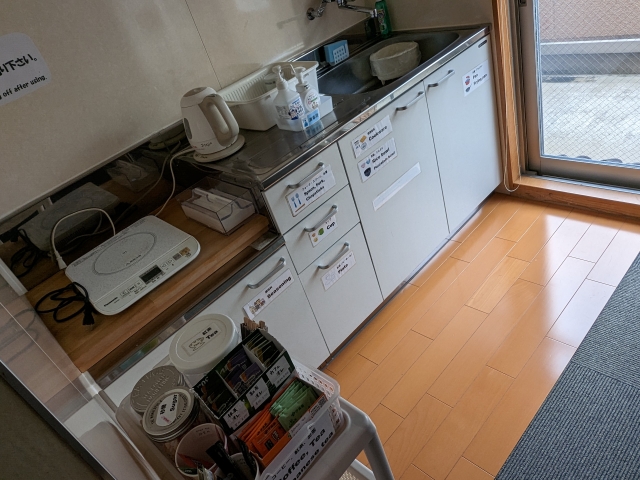 共有スペースには電子レンジ、オーブン、冷蔵庫、キッチンなどが完備。コーヒーやお茶などは自由に飲むことができます。