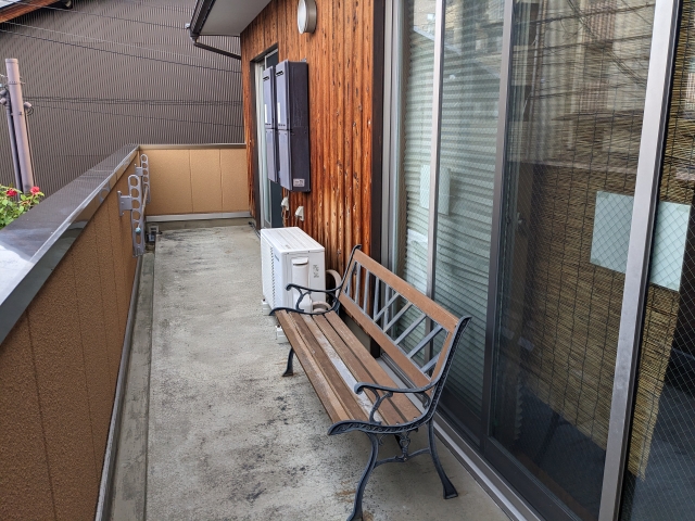 共有スペースにはバルコニーもあります。ベンチもあるので、お風呂上りにちょっと夜風にあたりたいときには最高です。モクモクしたい方もこちらで。