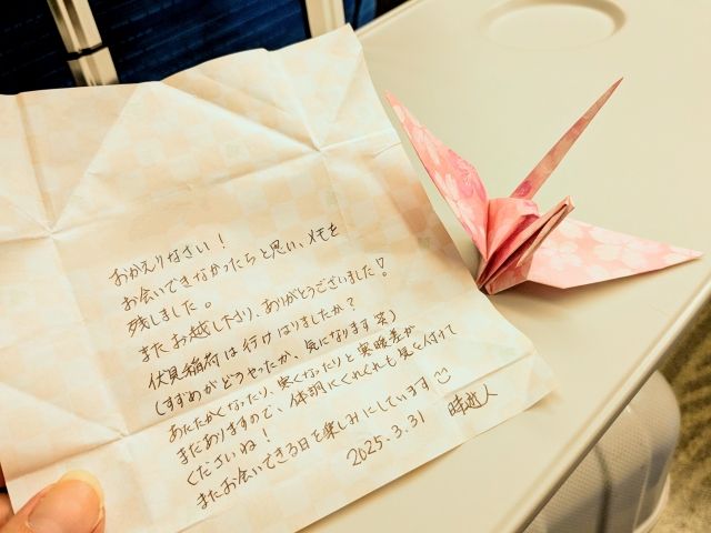 ということで2泊利用した時遊人。チェックアウト後、夕方まで荷物を預かってもらっていたのですが、よく見ると手紙を添えていてくれました!小さなお気遣いがとってもステキな宿です。