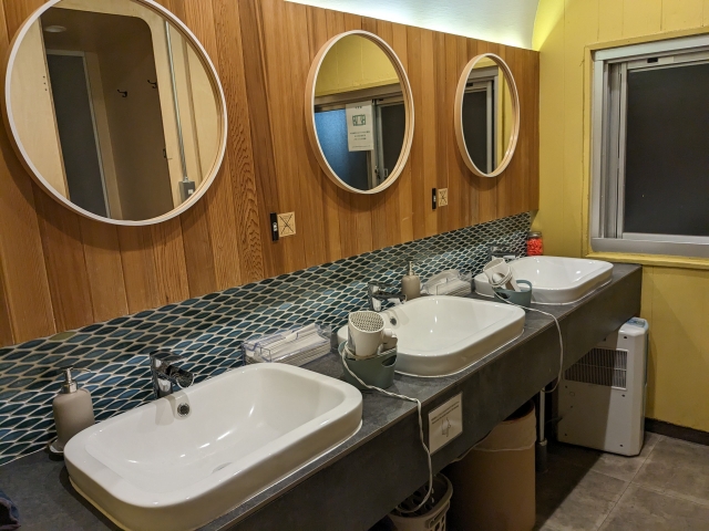 洗面所は2階に3基。ハンドソープやフリーの耳栓もあります。ドライヤーも備えていますが、21:00〜8:00になると撤去されて、1階のみになります。