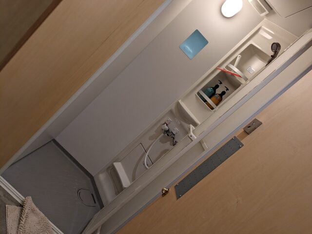 洗面台の向かいにはシャワールームが3基、そのうち1つは女性専用となっています。シャンプーとボディーソープは備え付けあり。