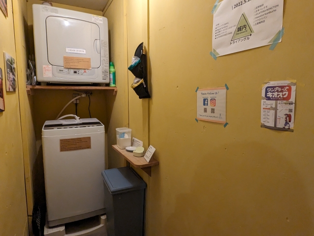 洗濯機は1基で、7:00~22:00と利用時間が決められています。道路挟んですぐのところにコインランドリーもあるため、困ったときはそちらへ。