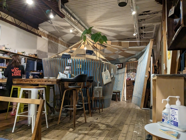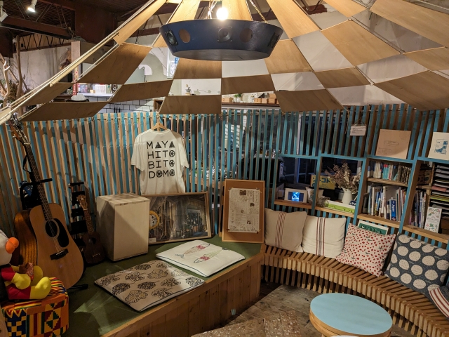 ラウンジにの奥に立つ印象的な木枠は、モンゴルのゲルをイメージしているというウワサ。ゲルの中には様々な書籍に加えて、アコギ・ウクレレ・カホンといった楽器もあります。天井には、特製のUFOスピーカーも・・・!