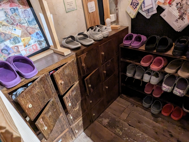 館内は基本土足ですが、室内履きのクロックスに履き替えます。シャワーやトイレへ行く際にいちいち靴を履かなくて良いのでとっても楽ですね。