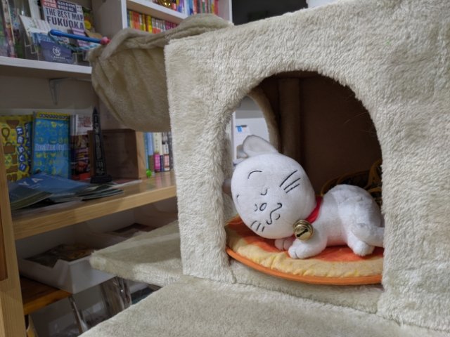 ここにはキャットタワーが設置されており、タイミングが良いと猫に会えるそう。私が訪問したときは別室で寝ていたため、タマしか会えませんでした。