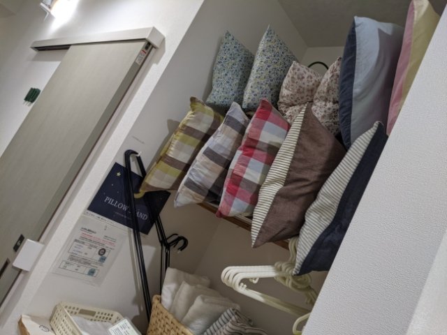 また、こちらのピロースタンドからはいらいろなマクラから自分好みなものを使うことができます。ながーいバスタオル用ハンガーもとってもありがたい設備です。