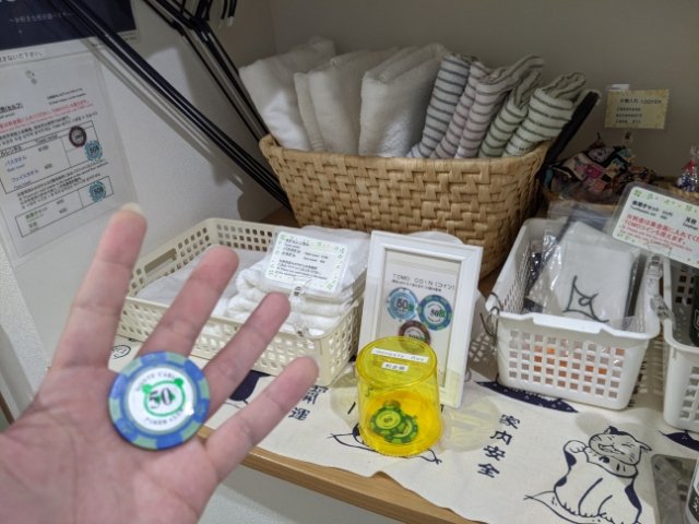 最初にもらえる50だと、小タオル、歯ブラシ、耳栓などと交換可能。日本円でプラス50円すれば、バスタオルや飲み物などと交換もできます。独自の硬貨という非常にユニークなシステムです。