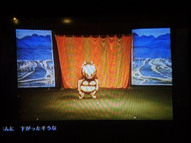隣に設置されたモニターでは、三味線の演奏に合せて動かされる様子を見ることができます。後ろで人が羽織るようにして操作しているのですが、ぽてぽてとコミカル。