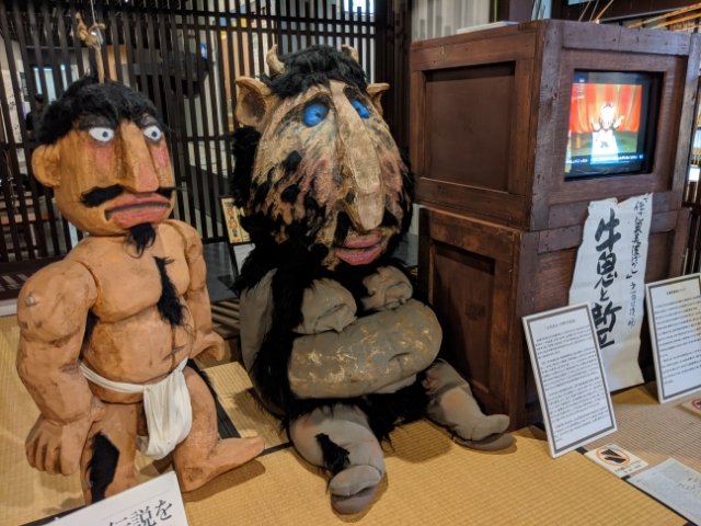 館内を歩いている、目に入ったのはこちらのインパクト抜群なキャラクター。こちらは、奥美濃むかし話「新平さと牛鬼」で使用される新平さと牛鬼の人形。