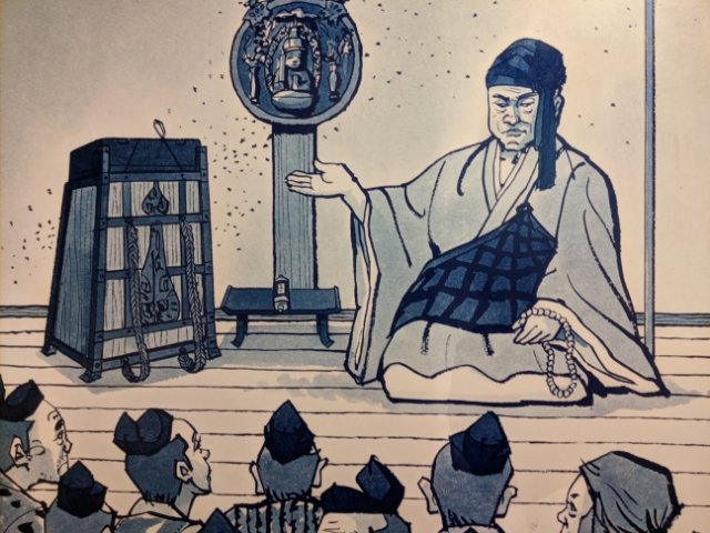 わかりやすいイラストがあったのですが、このように人々の前で壁にかけて説いていたのですね。今でいうスライド資料みたいなイメージでしょうか。