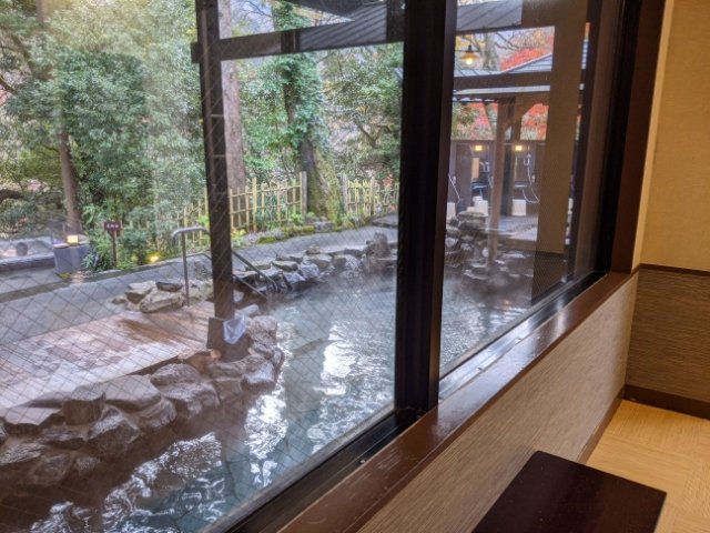 受付、大浴場、貸切個室露天風呂、食事処などは、それぞれ屋外の回廊でつながります。ところどころにベンチが設置されており、お風呂上りに涼んだりできます。