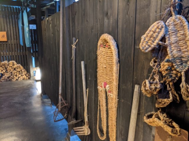 館内も雰囲気抜群!都会の温泉とはひと味違う、里山風の内装が魅力的。壁にかけられたクワやスキなどの農具、積まれた薪(タキギ)は、まるで山村の農家のような演出です。