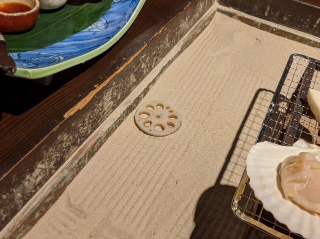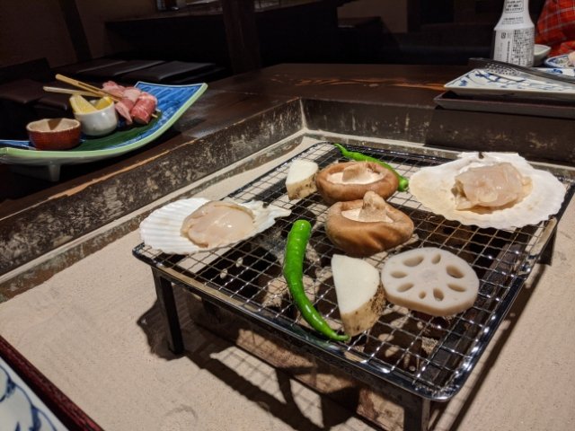 今回頼んだのはリッチなコース料理!「冬の囲炉裏コース」にしました。囲炉裏焼きは、ホタテ、れんこん、シイタケ、ヤマイモ、ししとう、焼きネギの豚肉巻き。炭火でじっくりゆっくりと焼いていきます。焼き上がったら、塩、柚子胡椒、味噌、おろしポン酢と好きな調味料で。