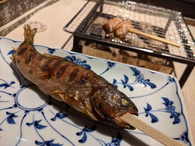 お魚はヤマメ。パリッパリに焼かれた状態で提供されるため、ヒレや皮はもちろん、しっぽや頭すらも美味しく食べれてしまいます。
