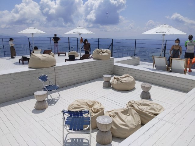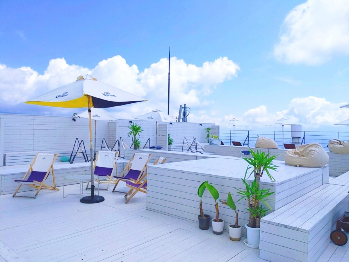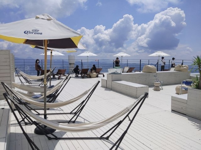 階段を登って行くと、目に飛び込むのは山の上とは思えないような真っ白な空間!!ベッドチェア、ビーズクッション、ハンモックなど、ラグジュアリーなシートがてんこ盛り。海辺ではありませんが、この雰囲気はビーチリゾートそのもの。