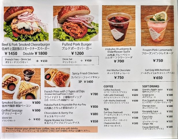 コーヒーや信州りんごジュースなどに加えて、ハンバーガーやフライドチキンなどもそろっています。地元産の食材を使用しており、ご当地感があるのも観光客には嬉しいです。