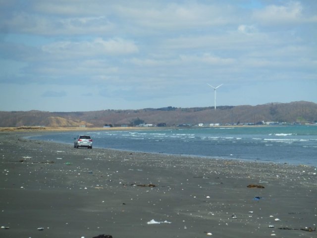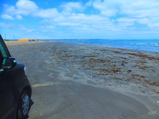 なお、ぱっと見は滑らかな砂浜ですが、実際は貝殻がバキバキエリアや、昆布ぐちゃぐちゃゾーンがあるのでご注意を。また、潮水や砂で車はもれなく汚れます!!その辺を覚悟のうえでお楽しみください。