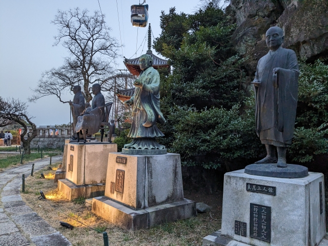 8体ならんだ人物像が、仏教の開祖師8人を表す八祖師像。良忍、日蓮、道元、親鸞、榮西、法然、弘法大師(空海)、伝教大師(最澄)と名だたる名僧が勢ぞろいです。