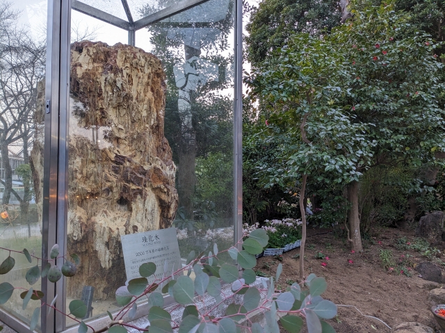 こちらのショーケースに展示されているのは珪化木(けいかぼく)という、2000万年前の植物の化石。大分県西国東郡大田村で出土したもので、日本最大の珪化木といわれています。