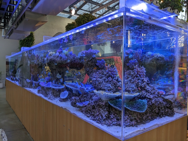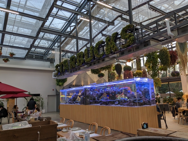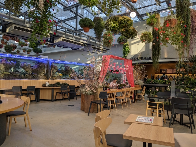 天井から吊るされた植物や、花が活けられたテーブルなど、HANA・BIYORIのコンセプトそのままなシート。水槽の目の前にも席が並んでおり、優雅に泳ぐお魚さんを眺めながらひと休みすることもできます。なお、ここに置かれた椅子やテーブルの一部は、2019年9月に関東地方を襲った台風15号によって被害を受けた樹木を再活用しているそうです。