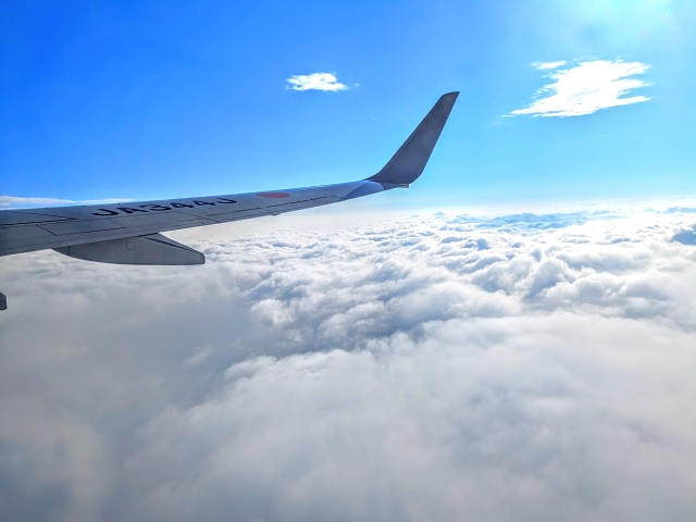 定刻を少し過ぎると機体は滑走路へ進み、離陸。羽田空港の天気はどんよりと曇っておりましたが、雲の上はきらきら輝く太陽と雲海の世界。