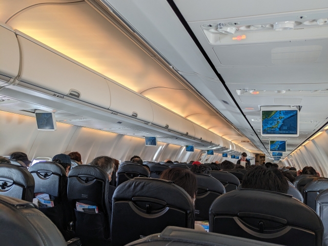 フライトタイ厶は1時間45分。実際に飛行している時間は半分程度なので、あっという間です。