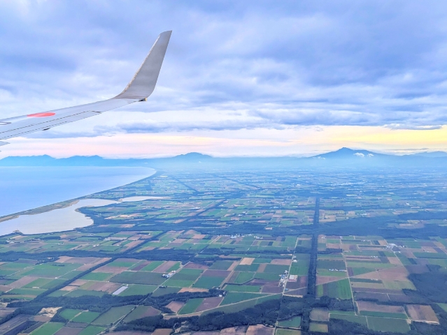 女満別空港に近づくと、機体は降下を開始。高度が下がり雲の下へと進むと、地上の風景が見渡せるようになってきます。能取湖や、網走監獄の「五翼放射状官舎」が見えてくるとワクワクしますね。