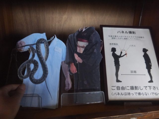 水槽に並んで置かれた謎のパネル。こちらは記念撮影用のアイテム。遠近法を上手く利用して撮影すると、ハブ捕り写真を撮ることができます。けっこう面白いことになりますよ!