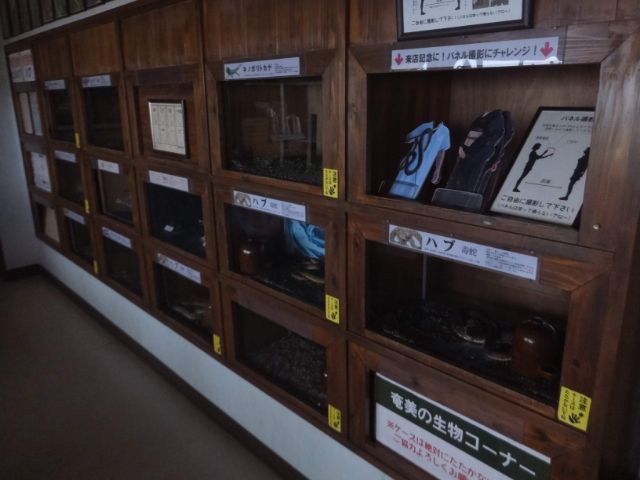 ショーだけでなく生体展示も楽しめます。店内の一角には水槽が並んでおり、そこにはハブをはじめとした様々な生き物たちが飼育されています。