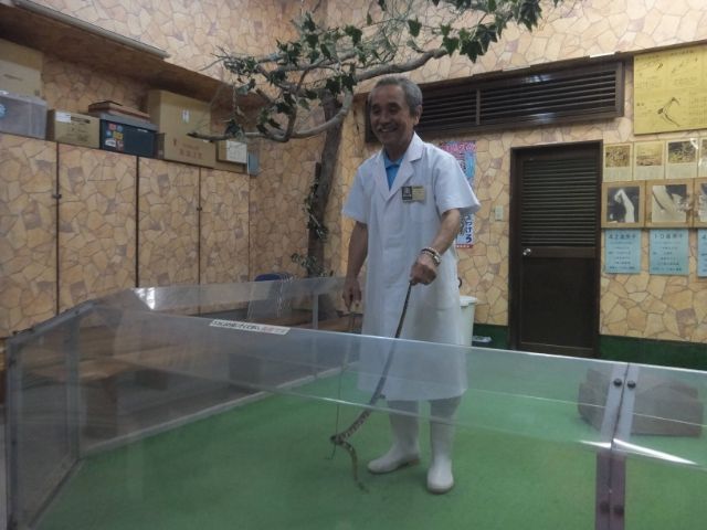 お店の奥にあるショールームで待っていると、おじさんが登場!!こちらのハブショーはマングースは使わないハブだけのショー。おじさんがハブの生態や人との関わりを解説してくれるのですが、もういちいち面白い!軽快なマシンガントークで次々とネタを挟んできます。