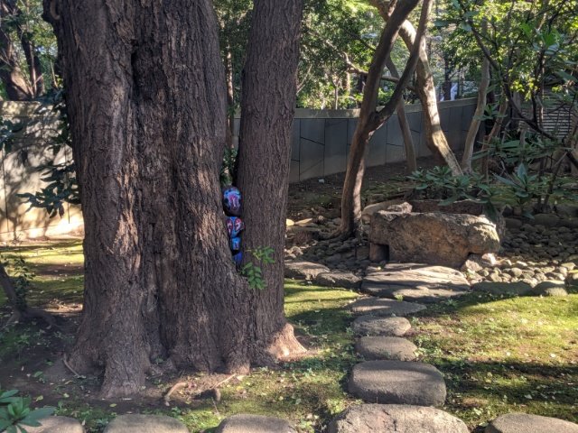 窓から美術館の庭園を見ると、そこにも作品が。加藤泉の作品は、室内よりも木々に囲まれた自然の中の方が似合いますね。