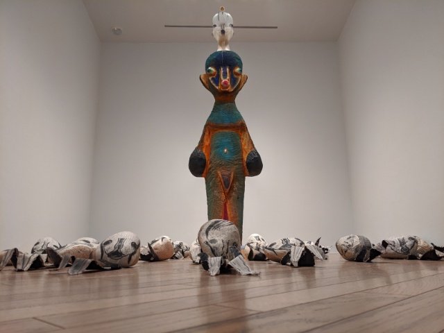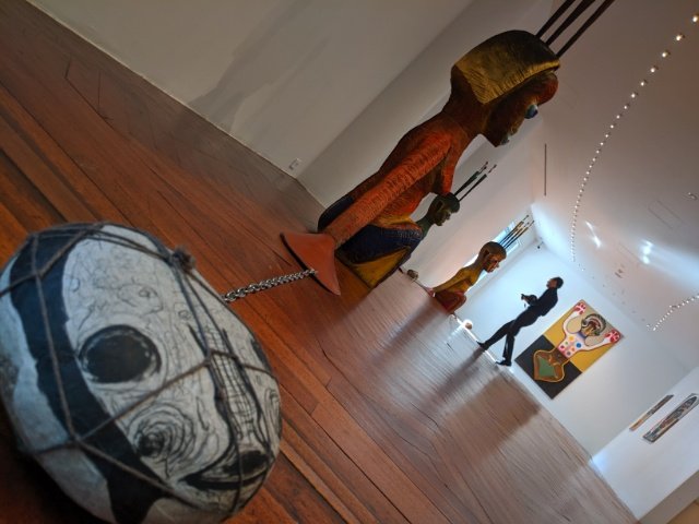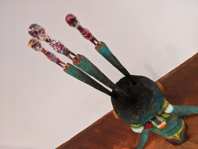 展示室に入ると、立ち込める木の香り。ショッキングという言葉がハマる、色鮮やかな作品たちが並びます。呪術的でありながら、どこか無垢な作品たちは、見る人を惹きつける不思議な魅力を放ちます。
