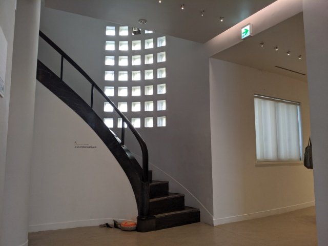 白塗りの壁に四角い格子状の窓が並ぶ螺旋階段に近いカ曲線を描く階段を上ると、『ゼロの空間』へとつながります。