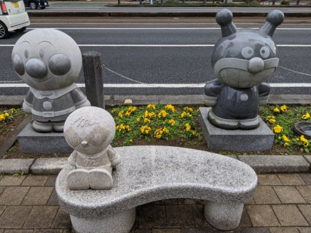 路肩にはアンパンマンキャラの石像が並ぶ。高知県はここは作者であるやなせたかしさんの故郷。駅前だけかと思いきや、街中のあちこちにたくさんのキャラクターが勢揃いしています。