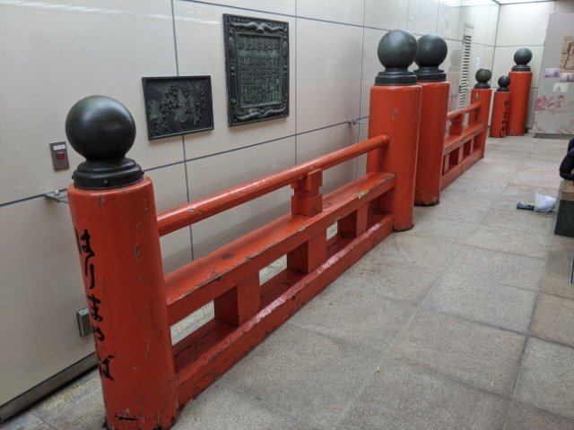 こちらはかつてはりまや橋に使用されていたもの。1998年、石造りの橋にリニューアルされた際、ここに欄干部分だけ保存・展示されることになりました。よく見ると昭和40年2/15改修と書かれています。