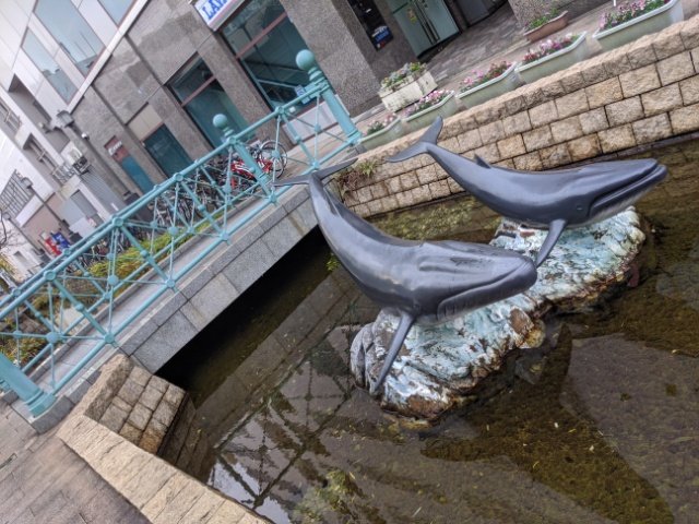 この歌碑からは1時間に1度歌声が流れ、それに合わせてクジラが潮を吹くというアクションがあるらしい。開催時間は8:30~20:30の毎時30分とのことです。