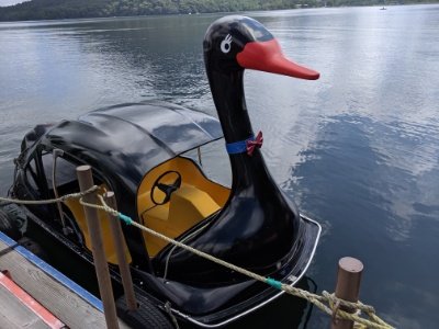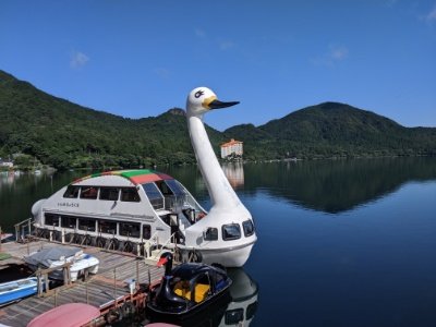 山中湖、相模湖、猪苗代湖、諏訪湖など日本各地の湖にいる白鳥型の遊覧船。この榛名湖にも大きな白鳥型の遊覧船が運行しています。すらっと伸びた首、キラキラの瞳&バッチリまつ毛がきれいな白鳥さん。カラフルな屋根がチャームポイントです。