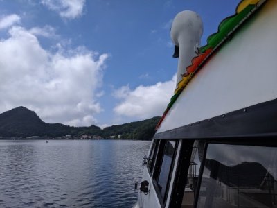 出港したはくちょう丸は榛名湖をぐるっと一回り。音声案内では、榛名山の情報や周辺の観光案内が流れる。榛名湖散策の前に乗船すると、いろいろ情報が入って楽しいのではないでしょうか。