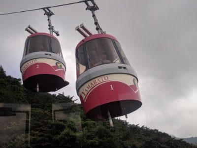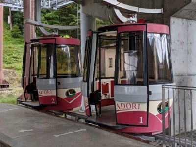 こちらのロープウェイはめずらしい2連式のゴンドラ!私の知る限りでは、このタイプは他に徳島県の眉山ロープウェイくらい。けっこうレアなのではないでしょうか。