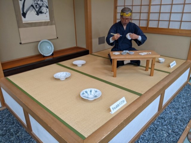 再現された絵付師の座敷。人形の絵付師が筆を握っているのですが、なんとこの人形動きます!!佐渡島の「佐渡歴史伝説館」や栃木の「塚田歴史伝説館」と同じタイプのハイテクロボットで、かなりリアルな動きをします。
