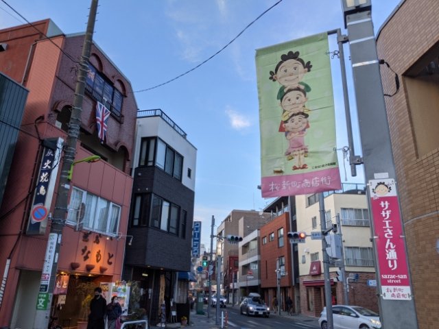 駅から南にのびる商店街はサザエさん通りと呼ばれています。配電盤やお店の壁など、様々なところにサザエさんが描かれた楽しいストリート。ここを抜けると、美術館&記念館へとつながっていきます。