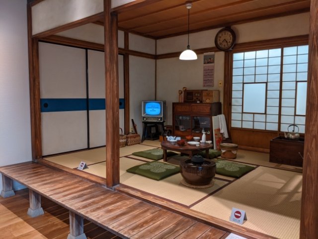 展示品は撮影禁止ですが、一部撮影可能なポイントもあります。サザエさんの世界を再現した昭和の部屋では、ブラウン管テレビにサザエさんの漫画が映し出されています。