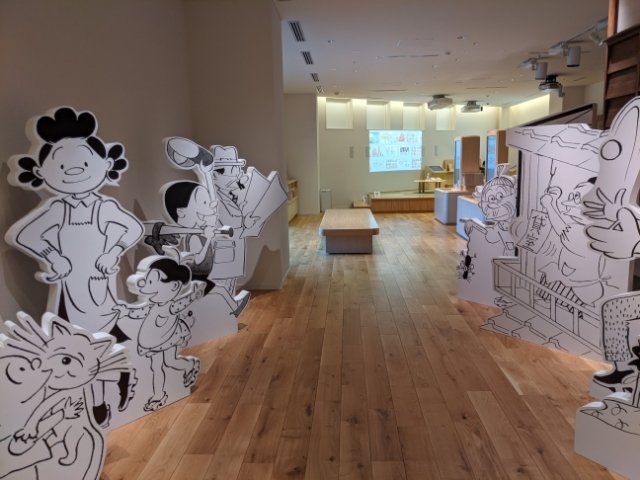 しかし、ファンからの要望に答えるため一角に町子コーナーが作られました。新しく長谷川町子記念館ができた現在、そこはアニメコーナーとなっています。アニメができるまでを紹介したパネル、キャラクター紹介、磯野家の模型、書籍などが置かれています。モニターでは、実際のアニメも上映中。