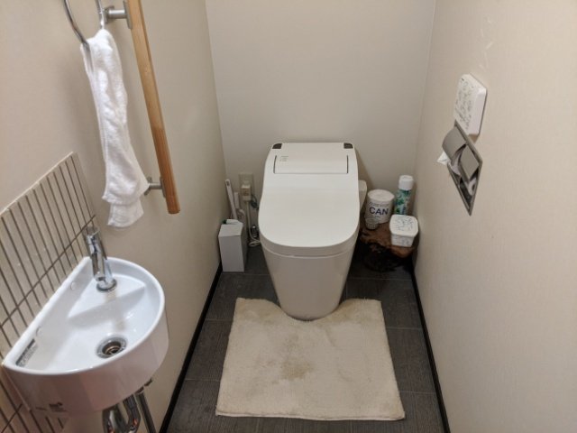 トイレもぴかぴか。手洗い場や消臭スプレーも備えています。もちろんウォシュレット付きです。