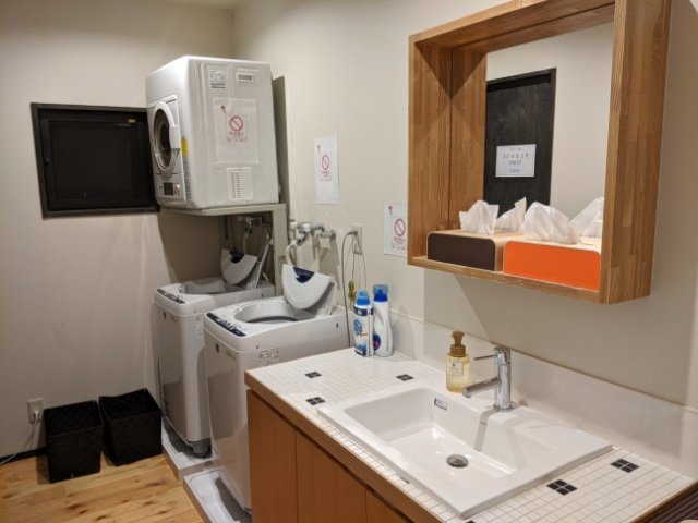 洗面台と洗濯機。今回は2泊3日だったため利用しませんでしたが、長期滞在する方にはありがたい設備。乾燥機も付いているので、雨の日でも安心です。