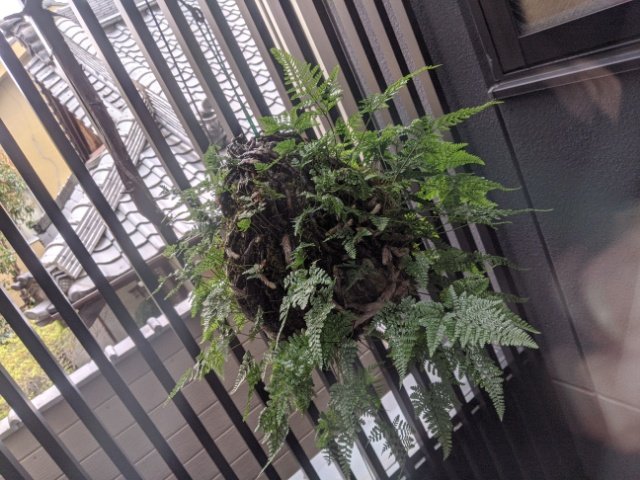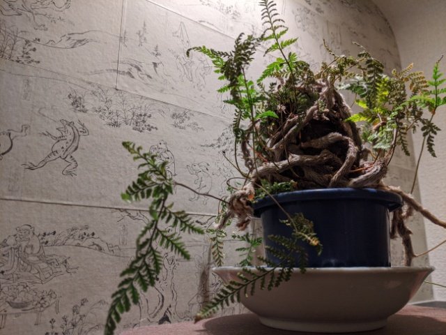 階段の踊り場に置かれた作品。とぐろを巻く龍の如く、シダ植物が巻き上がっています。鳥獣戯画の壁紙との組み合わせが何ともお洒落。