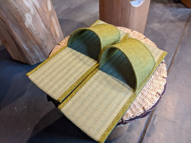 細部へのこだわりはスリッパにも。四角い畳仕立ての独特な形状をしています。グリーンのカラーリングは館内のインテリアとぴったりハマります。