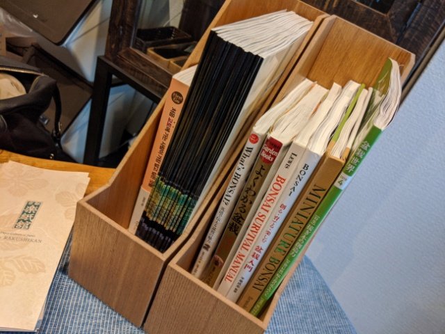 フリースペースには「よくわかる盆栽」や「盆栽入門」といった盆栽関連の書籍が並びます。日常生活では触れ合う機会が少ない盆栽という文化を知ることができる宿です。