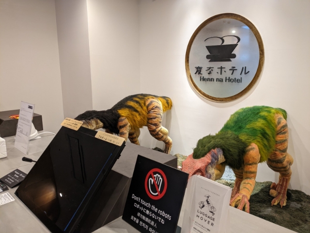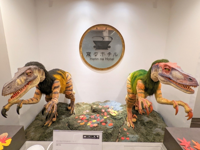 さてさて、そんなわけで前乗りした初日に利用した変なホテル。翌朝出発にあたりチェックアウトしようとすると、恐竜たちがおじぎしておりました!朝は活動停止してるみたいです。